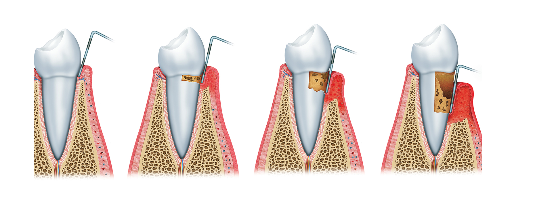 Kommen weitere Faktoren, wie z. B. Stress, Rauchen oder eine andere Erkrankung hinzu, kann es zu einer akuten Entzündungsreaktion kommen. Das Zahnfleisch ist gerötet, geschwollen und neigt zur Blutung. Im Verlauf der Erkrankung bilden sich tiefe Zahnfleischtaschen, eine Brutstätte für weitere Bakterien. Das Immunsystem versucht, diese Bakterien zu beseitigen. Hierbei kommt es zu verschiedenen Reaktionen, unter anderem werden Stoffe (Enzyme) gebildet, die die krankmachenden Bakterien eliminieren sollen. Diese Enzyme beseitigen jedoch nicht nur die schädlichen Bakterien, sondern zerstören auch den Zahnhalteapparat. Im fortgeschrittenen Stadium kann es zum Abbau des Kieferknochens und letztlich zum Zahnverlust kommen. Ohne intakten Zahnhalteapparat hat der Zahn in der Zahntasche (Alveole) keinen Halt mehr, er beginnt sich zu lockern und kann möglicherweise verloren gehen.